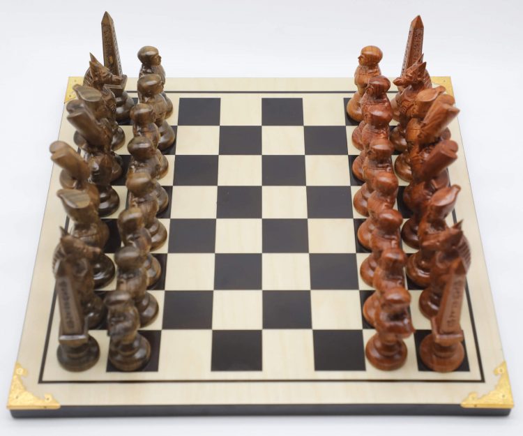 The Ancient Egyptian chess board is designed with chess pieces to create harmony and transparency between the chessboard and the pieces. However, this set of chess pieces can also be displayed with chess boards such as 3D Chess Board, Engraved Chess Board or other popular chess boards.